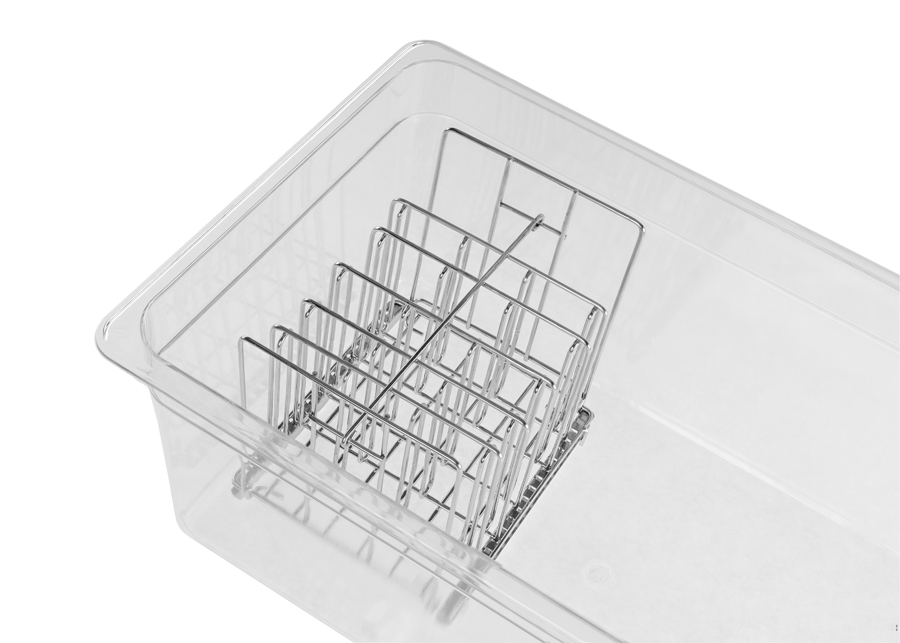 Mit den praktischen Sous-Vide-Beutelhalter aus hochwertigem Edelstahl (rostfrei) können mehrere Garbeutel gleichzeitig im Sous-Vide-Becken fixiert werden. So erzielen Sie auch beim gleichzeitigen Zubereiten von mehreren Beuteln gleichmäßige Garergebnisse.